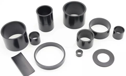 Bonded NdFeB is produced by a technique whereby a special form of NdFeB powder is blended with a plastic carrier material, die pressed and then heated. Parts made in this way can be of complex shapes and come off the tool with close tolerances, requiring no further finish machining. They have lower energy products than Sintered NdFeB - in the range of 10 MGOe. The Bonded NdFeB materials are isotropic - i.e. they can be magnetized in any direction.